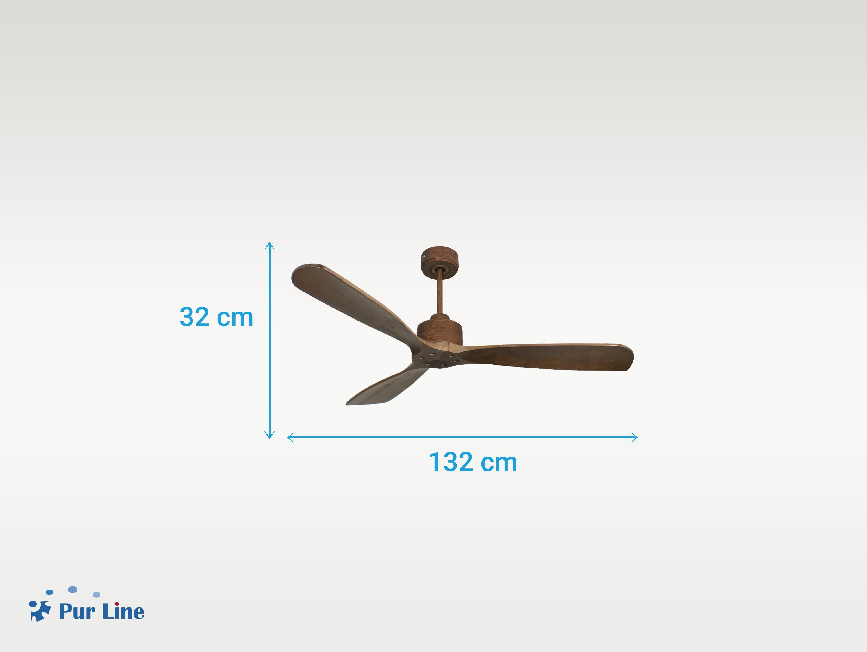 El motor de corriente continua (DC) Klassfan by Purline, es un motor de alta calidad con unas prestaciones de alto nivel. Permite instalaciones en techos de hasta 15º de inclinación y se sirve con dos tijas para que se instale a la altura adecuada (13.5 cm y 25 cm). Permite 2 o 3 aspas (dependiendo del modelo de aspa), pues dispone de una función de auto equilibrado. Todos los motores permite incluir un kit de luz.Es un motor con función Verano/Invierno (Desestratificador de aire), de forma que en invierno podrás invertir el movimiento del motor, para que su giro desplace el aire caliente hacia abajo, actuando como complemento de tu sistema de calefacción y favoreciendo un consumo optimizado con un importante ahorro energético. Además incluye un termostato en su base superior, que te permite programar el ventilador para funcione según la temperatura ambiente.Una ventaja muy destacada, es su sistema FullFlow patentado, que permite calibrar el consumo y la potencia del motor, a las necesidades de las palas elegidas, logrando unos resultados espectaculares en rendimiento energético. Nuestro sistema Fullflow permite una verdadera versatibilidad.Ademas cuenta con multitud de ventajas adicionales como 6 velocidades programables (fullflow), temporizador (8h) y posibilidad de control remoto mediante mando a distancia, mando de pared y conexión WiFi con la aplicación Tuya Smart, para poder utilizar el ventilador desde cualquier dispositivo móvil. Cuenta también con sistema certificado Hypersilence, una tecnología súper silenciosa a velocidad 3 y que permite utilizar el ventilador por las noches o en momentos de descansos, ofreciendo un rendimiento muy silencioso y con un consumo muy reducido, pudiendo llegar de 3 a 5 W, con aspas de 106 cm.También dispone de una función de memoria que guarda la configuración utilizada, tanto de velocidad como de luz, si así está equipado, de forma que cuando se apaga el ventilador se guarda y cuando se vuelve a encender arranca con la misma configuración. Las palas aerodinámicas de madera balsa maciza otorgan al ventilador una gran ligereza. Han sido artesanalmente tratadas para estar equilibradas y no producir ningún tipo de vibración. Este modelo de 3 aspas acabadas en madera oscura tiene un diámetro de 132 cm